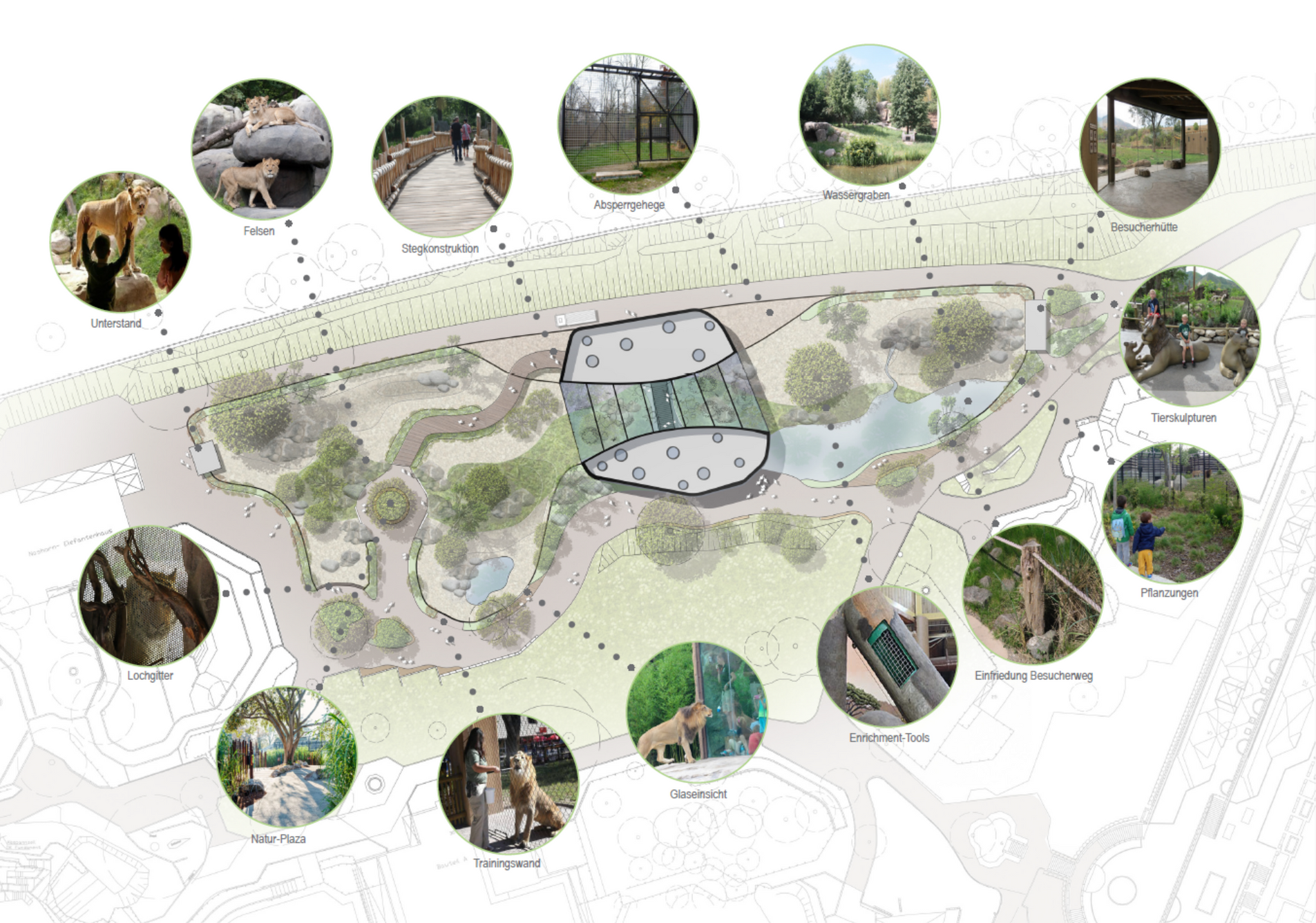 Der Entwurf sieht einen zweigeschossigen Neubau in zentraler Lage des Planungsbereiches vor. Der Baukörper wird von einem vollverglasten Atrium durchzogen, in welchem die Schauräume der Raubtiere liegen. An das Atrium angrenzend wird das Gebäude beidseitig von zwei Freianlagen flankiert. Zentraler Gedanke der Planung ist die Verschmelzung des Besucherbereiches mit dem Tierbereich im Herzen des Gebäudes. Die Besucher*innen besitzen dank großflächiger Verglasungen die Gelegenheit inmitten der Raubtiere zu stehen und die Natürlichkeit der Anlage im Kontrast zur Architektur auf sich wirken zu lassen. Ergänzt wird der verglaste Innenraum durch zwei massive Gebäudeteile, in denen weitere Gehege, Pflegerbereiche sowie Sanitäranlagen zu finden sind.